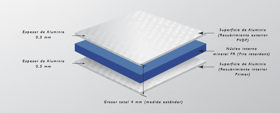 El Panel Composite, también conocido como panel de Aluminio compuesto (ACP, por sus siglas en inglés). Fabricado a partir de dos láminas de Aluminio con un núcleo interno mineral FR (Fire Retardant), que dota al material de planicidad, ligereza y resistencia al fuego. El panel Composite Laminex se suministra con acabados en pintura PVdf (bicapa).